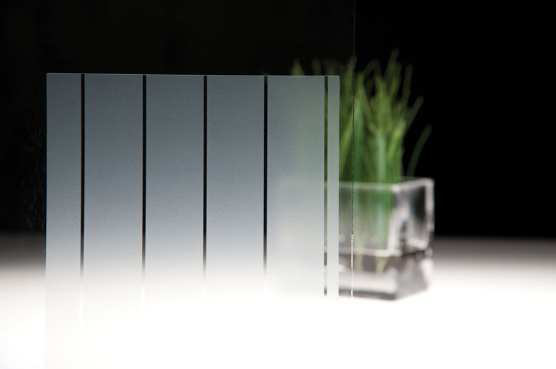 Attractive patterns are created with various combinations of etched lines and bars, from grid-like structures to the elegant simplicity of varying line lengths and thicknesses, including wider strips of opacity. Whatever combination you choose, these horizontal bands of various sizes are an elegant way to screen the passage of light. The Leise pattern, in particular, offers a nice, subtle haze effect.